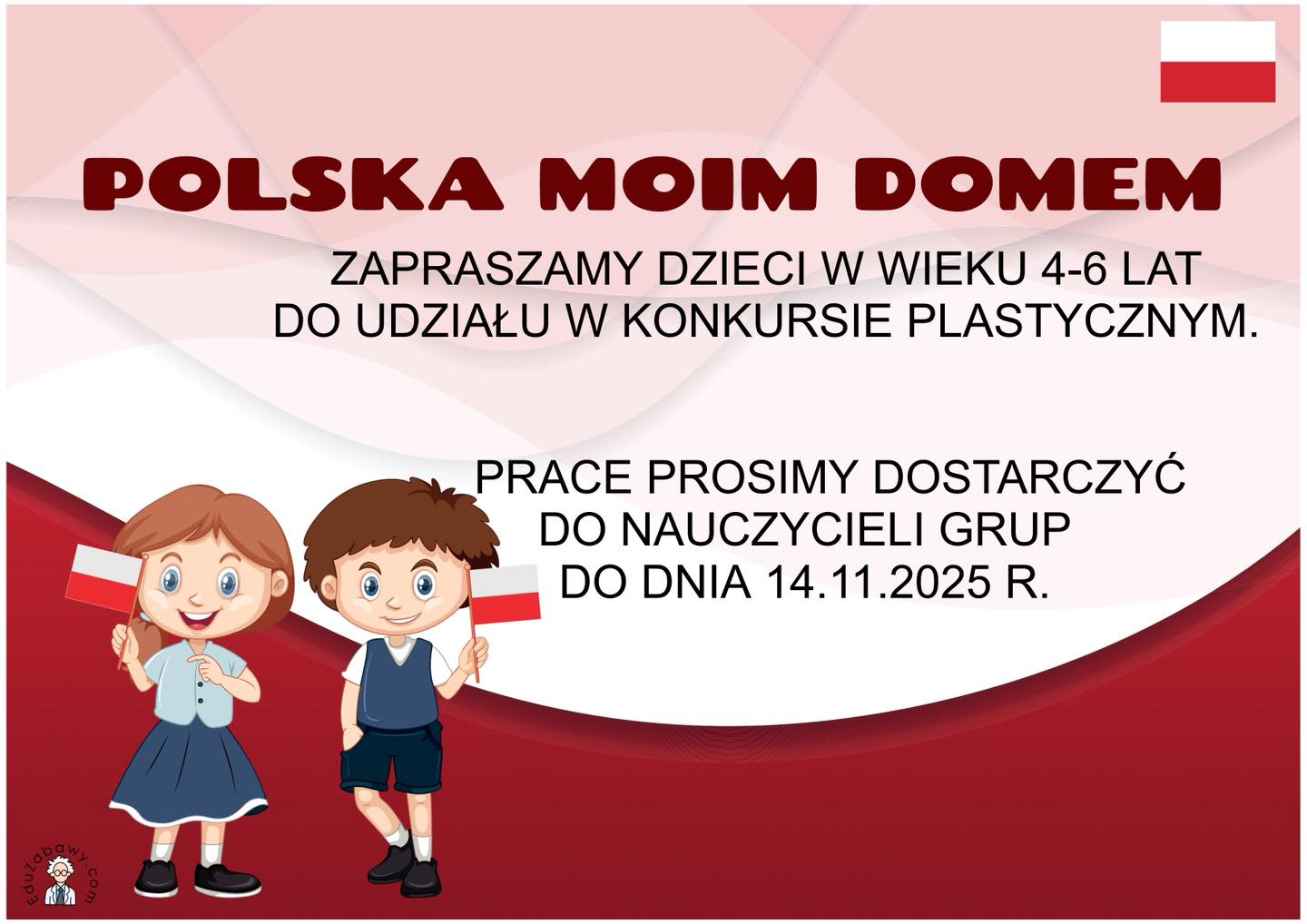 🇵🇱 Polska moim domem 🇵🇱 – zapraszamy dzieci  i rodziców do wzięcia udziału w przedszkolnym konkursie plastycznym .