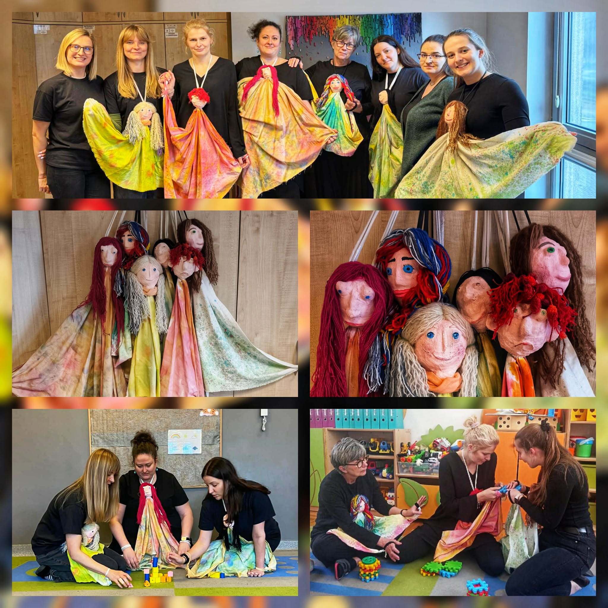 Oto kulisy działań w ramach wewnątrzprzedszkolnego projektu dotyczącego radzenia sobie w sytuacjach konfliktowych. Główne bohaterki odwiedziły grupy 4, 5 i 6-latków gdzie za pomocą form parateatralnych podpowiadały, jak radzić sobie ze złością. Pomagały im laleczki handmade wykonane przez kadrę specjalistów Tęczowego Domku pod czujnym okiem naszej arteterapeutki, Pani Oli.
